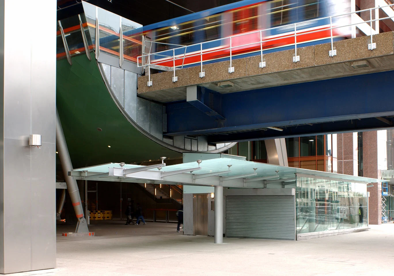 The development of Heron Quays station, adjacent to Canary Wharf, required the rebuilding of the small Docklands Light Rail station to integrate with the new structures. The complex brief dictated that the structure be wholly enclosed by the office development but be completely self supporting, with no structural connection to the buildings either side and above or the railway bridge itself.